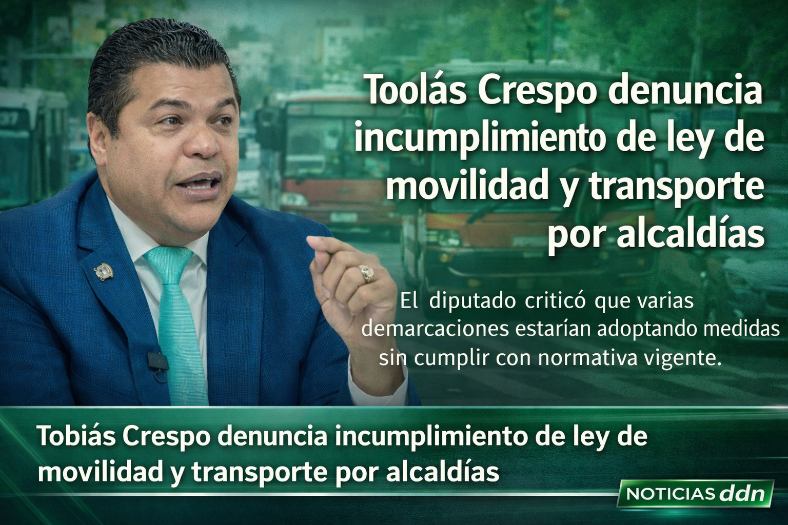 Santo Domingo. — El diputado Tobías Crespo denunció que varias alcaldías del país estarían incumpliendo disposiciones establecidas en la Ley de Movilidad, Transporte Terrestre, Tránsito y Seguridad Vial, lo que —según afirmó— afecta la correcta organización del tránsito y la seguridad ciudadana.